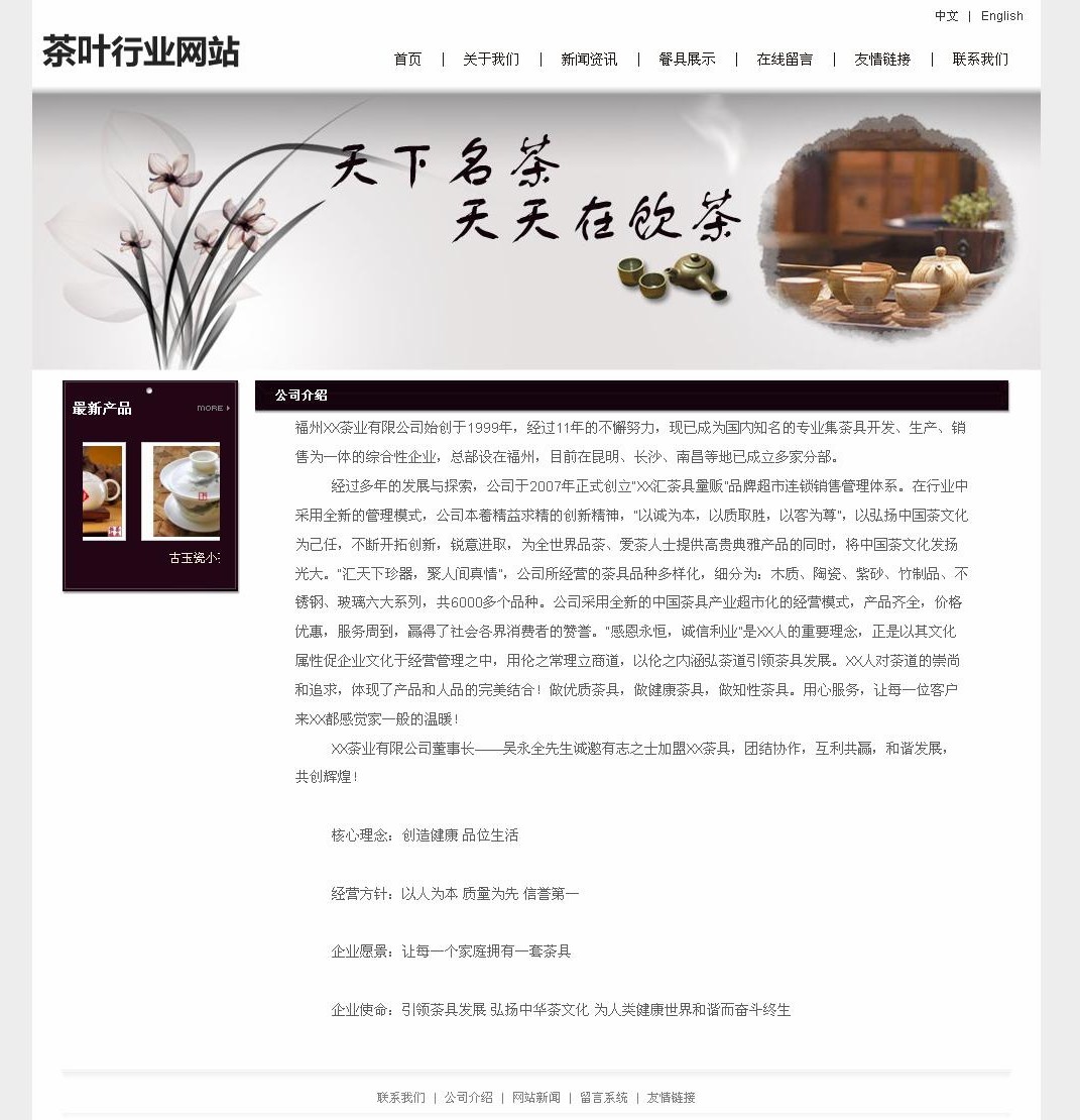 經(jīng) 過多年的發(fā)展與探索,公司于2007年正式創(chuàng)立“XX匯茶具量販”品牌超市連鎖銷售管理體系。在行業(yè)中采用全新的管理模式,公司本著精益求精的創(chuàng)新精神, “以誠為本,以質(zhì)取勝,以客為尊”,以弘揚中國茶文化為己任,不斷開拓創(chuàng)新,銳意進(jìn)取,為全世界品茶、愛茶人士提供高貴典雅產(chǎn)品的同時,將中國茶文化發(fā)揚 光大。“匯天下珍器,聚人間真情”,公司所經(jīng)營的茶具品種多樣化,細(xì)分為:木質(zhì)、陶瓷、紫砂、竹制品、不銹鋼、玻璃六大系列,共6000多個品種。公司采 用全新的中國茶具產(chǎn)業(yè)超市化的經(jīng)營模式,產(chǎn)品齊全,價格優(yōu)惠,服務(wù)周到,贏得了社會各界消費者的贊譽。“感恩永恒,誠信利業(yè)”是XX人的重要理念,正是以 其文化屬性促企業(yè)文化于經(jīng)營管理之中,用倫之常理立商道,以倫之內(nèi)涵弘茶道引領(lǐng)茶具發(fā)展。XX人對茶道的崇尚和追求,體現(xiàn)了產(chǎn)品和人品的完美結(jié)合!做優(yōu)質(zhì) 茶具,做健康茶具,做知性茶具。用心服務(wù),讓每一位客戶來XX都感覺家一般的溫暖!